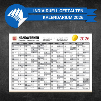 Jahresplaner für Handwerksbetriebe sind die ideale Lösung, um Baustellen, Termine und Urlaube auf einen Blick im Griff zu behalten. Die Wandkalender lassen sich mit Ihrem Logo, Ihren Farben und Kontaktdaten individuell gestalten und passen so perfekt zu Ihrem Firmenauftritt. Praktisch im Alltag, stark in der Wirkung – auch als nützliches Werbegeschenk für Geschäftskunden und Partner.