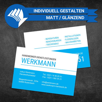 Erstellen Sie Ihre professionelle, personalisierte Visitenkarte für Handwerker. Mit unserem benutzerfreundlichen Online-Editor können Sie Ihre Visitenkarten individuell anpassen und direkt bestellen. Zeigen Sie Ihren einzigartigen Stil und beeindrucken Sie potenzielle Kunden. Hochwertige Materialien und schnelle Lieferung inklusive. Erstellen Sie Ihre perfekte und einzigartige Visitenkarte noch heute!