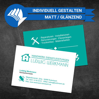 Erstellen Sie Ihre professionelle, personalisierte Visitenkarte für Handwerker. Mit unserem benutzerfreundlichen Online-Editor können Sie Ihre Visitenkarten individuell anpassen und direkt bestellen. Zeigen Sie Ihren einzigartigen Stil und beeindrucken Sie potenzielle Kunden. Hochwertige Materialien und schnelle Lieferung inklusive. Erstellen Sie Ihre perfekte und einzigartige Visitenkarte noch heute!
