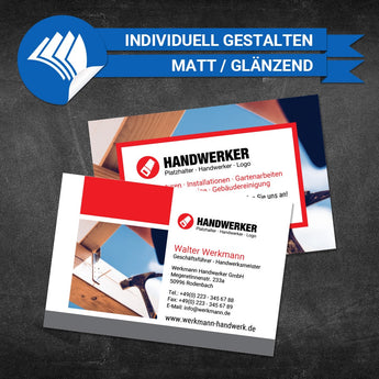 Erstellen Sie Ihre professionelle, personalisierte Visitenkarte für Handwerker. Mit unserem benutzerfreundlichen Online-Editor können Sie Ihre Visitenkarten individuell anpassen und direkt bestellen. Zeigen Sie Ihren einzigartigen Stil und beeindrucken Sie potenzielle Kunden. Hochwertige Materialien und schnelle Lieferung inklusive. Erstellen Sie Ihre perfekte und einzigartige Visitenkarte noch heute!