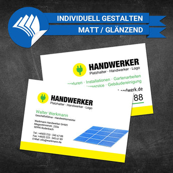 Erstellen Sie Ihre professionelle, personalisierte Visitenkarte für Handwerker. Mit unserem benutzerfreundlichen Online-Editor können Sie Ihre Visitenkarten individuell anpassen und direkt bestellen. Zeigen Sie Ihren einzigartigen Stil und beeindrucken Sie potenzielle Kunden. Hochwertige Materialien und schnelle Lieferung inklusive. Erstellen Sie Ihre perfekte und einzigartige Visitenkarte noch heute!