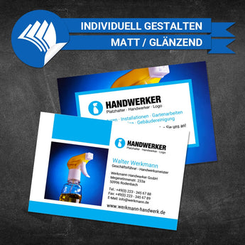 Erstellen Sie Ihre professionelle, personalisierte Visitenkarte für Handwerker. Mit unserem benutzerfreundlichen Online-Editor können Sie Ihre Visitenkarten individuell anpassen und direkt bestellen. Zeigen Sie Ihren einzigartigen Stil und beeindrucken Sie potenzielle Kunden. Hochwertige Materialien und schnelle Lieferung inklusive. Erstellen Sie Ihre perfekte und einzigartige Visitenkarte noch heute!