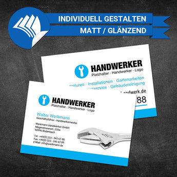 Erstellen Sie Ihre professionelle, personalisierte Visitenkarte für Handwerker. Mit unserem benutzerfreundlichen Online-Editor können Sie Ihre Visitenkarten individuell anpassen und direkt bestellen. Zeigen Sie Ihren einzigartigen Stil und beeindrucken Sie potenzielle Kunden. Hochwertige Materialien und schnelle Lieferung inklusive. Erstellen Sie Ihre perfekte und einzigartige Visitenkarte noch heute!