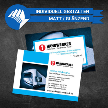 Erstellen Sie Ihre professionelle, personalisierte Visitenkarte für Handwerker. Mit unserem benutzerfreundlichen Online-Editor können Sie Ihre Visitenkarten individuell anpassen und direkt bestellen. Zeigen Sie Ihren einzigartigen Stil und beeindrucken Sie potenzielle Kunden. Hochwertige Materialien und schnelle Lieferung inklusive. Erstellen Sie Ihre perfekte und einzigartige Visitenkarte noch heute!