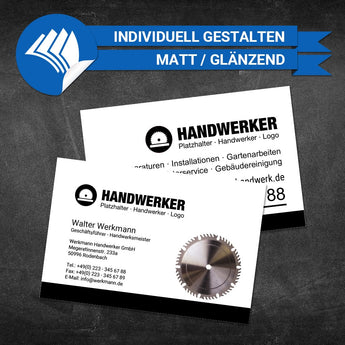 Erstellen Sie Ihre professionelle, personalisierte Visitenkarte für Handwerker. Mit unserem benutzerfreundlichen Online-Editor können Sie Ihre Visitenkarten individuell anpassen und direkt bestellen. Zeigen Sie Ihren einzigartigen Stil und beeindrucken Sie potenzielle Kunden. Hochwertige Materialien und schnelle Lieferung inklusive. Erstellen Sie Ihre perfekte und einzigartige Visitenkarte noch heute!