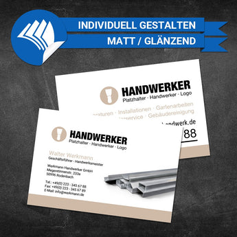 Erstellen Sie Ihre professionelle, personalisierte Visitenkarte für Handwerker. Mit unserem benutzerfreundlichen Online-Editor können Sie Ihre Visitenkarten individuell anpassen und direkt bestellen. Zeigen Sie Ihren einzigartigen Stil und beeindrucken Sie potenzielle Kunden. Hochwertige Materialien und schnelle Lieferung inklusive. Erstellen Sie Ihre perfekte und einzigartige Visitenkarte noch heute!